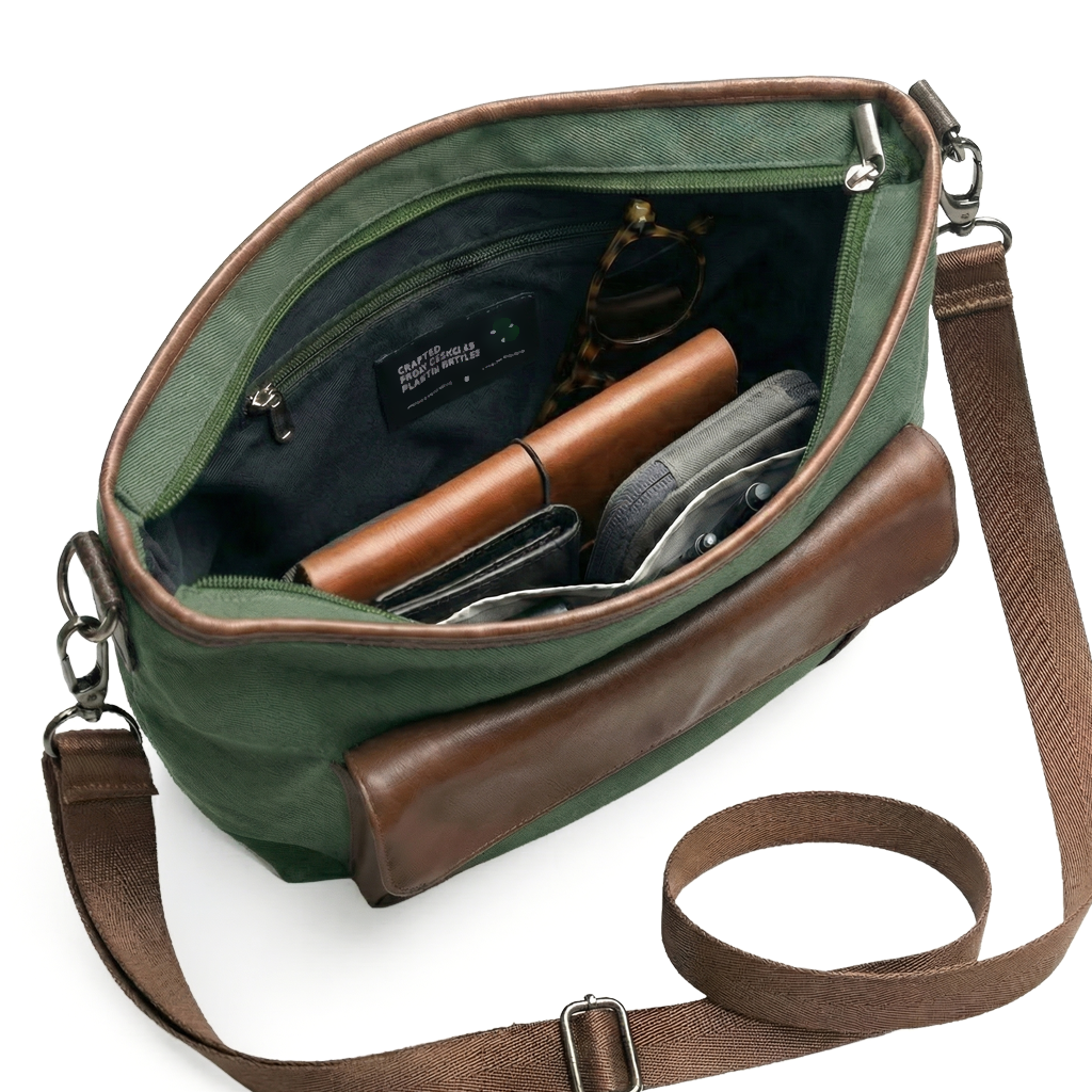 Comfortable crossbody carry with zipper closure, made from recycled PET bottle fabric with premium trims.